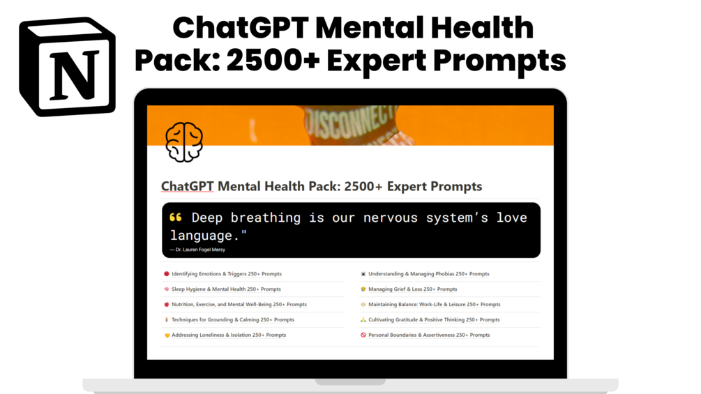 We live in a fast-paced, ever-changing world that can sometimes feel overwhelming. But there's no need to let the chaos get the better of you. Embrace the challenges and transform your life with the ChatGPT Mental Health Pack. Explore over 2500 expertly curated prompts, specifically designed to empower you to navigate life's ups and downs.