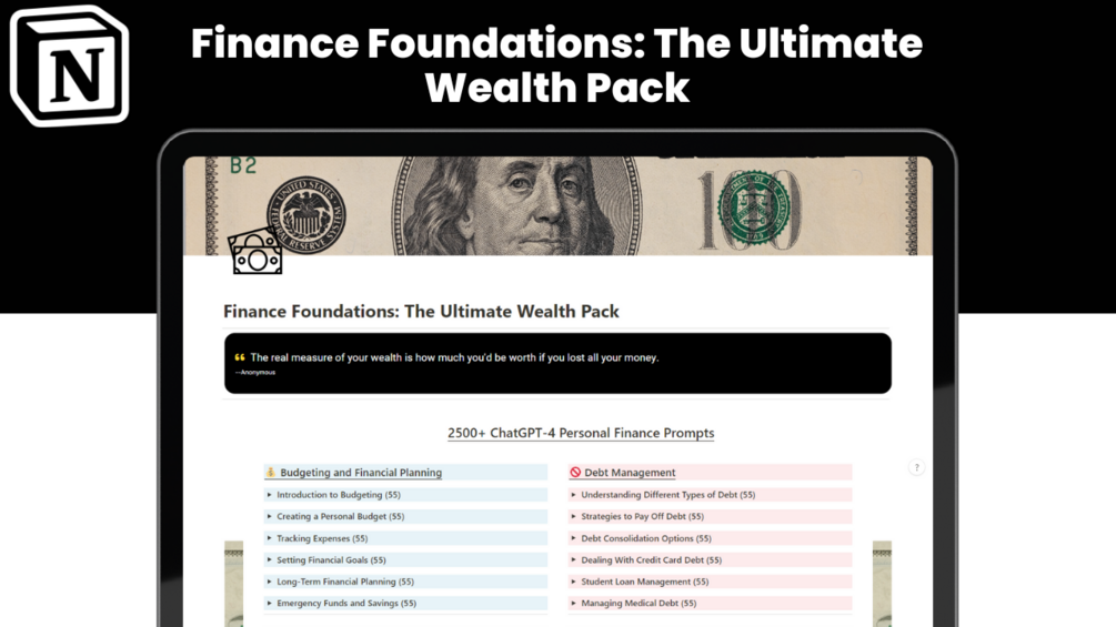 Introducing "The Ultimate Wealth Pack" - a comprehensive collection of 2500+ ChatGPT-4 Personal Finance Prompts designed to empower you with the knowledge and tools to take control of your financial future.